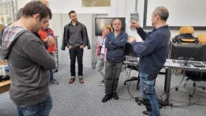 In zwei Gruppen wurde das Kollegium durch die Hallen, Labors und Roboterräume der HFU Dependance in Rottweil geführt. Volker Bucher hielt einen hochinteressanten und kurzweiligen Vortrag und stellte aktuelle Forschungsbereiche vor. Das Kollegium erfuhr über bahnbrechende Neuerungen auf dem Gebiet der Verkapselung von Implantaten oder Orthesen aus dem 3D Drucker. Aber auch über die nachlassende Flexibilität der menschlichen Augenlinse im Alter und wie diese wieder durch ein elektronisches Implantat im Auge ersetzt werden könnte.