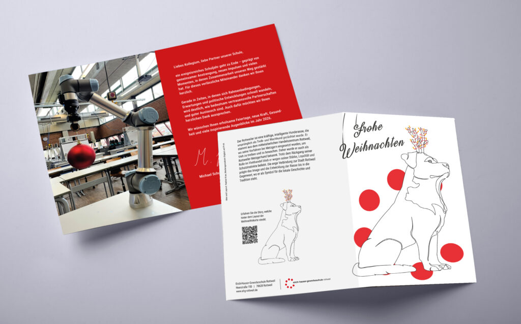 Jede Karte ist individuell und liebevoll gestaltet, was auch Herr Schuler – der Schulleiter – gesehen hat und würdigen möchte. Jede/r Schüler:in hat in einer schön aufbereiteten Präsentation und Dokumentation versucht, Herrn Schuler von seiner/ihrer Karte zu überzeugen. Nach einer langen schwierigen Entscheidung wurde die Karte von Nadine Kran für 2025 gewählt und die Karte von Jana Franke für 2024. Die diesjährige Karte hat den weihnachtlich dekorierten Rottweiler Hund, kombiniert mit dem Logo der EHG als Motiv. Die Karte von 2024 hatte grüne, gestapelte Päckchen als Weihnachtsbaum angeordnet und es wurde mit spannenden Cut-Outs gearbeitet. Der Schulleiter möchte den anderen Schüler:innen für ihren kreativen Einsatz danken, so kam die Idee, alle Designs hier auf der Website von der EHG aufzuzeigen und die nächsten Jahre weitere Karten der diesjährigen Designs zu drucken.